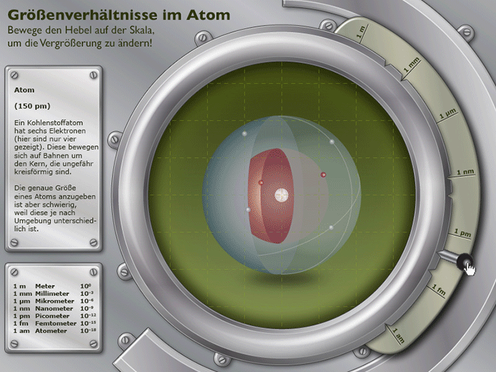 ”Größenverhältnisse im Atom“Screens für ein interaktives Lernspiel